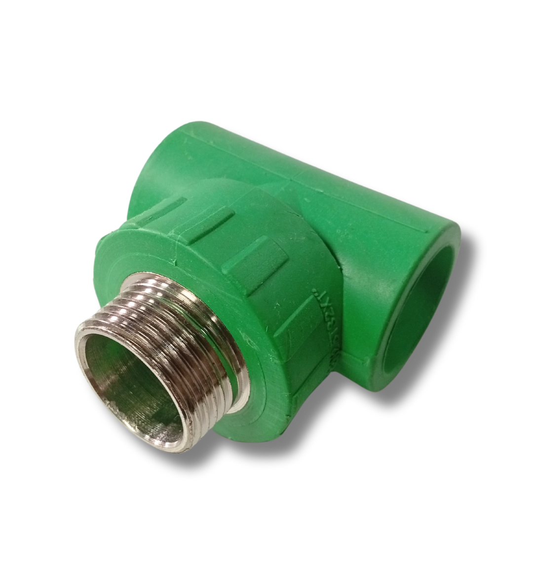 The PPR Male Tee is a three-way fitting with two PPR fusion ends and one brass male-threaded outlet, designed to join PPR pipes while connecting to threaded components like valves or taps.